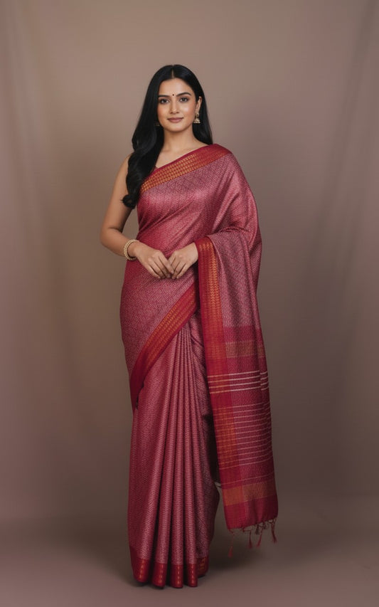 Sutrayan Ruby Weave - Handwoven Red Silk Saree with Subtle Diamond Checks and Zari Border