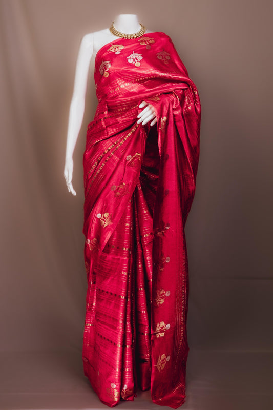 Sutrayan Scarlet Bloom — Handwoven Red Silk Saree with Floral Zari Butta