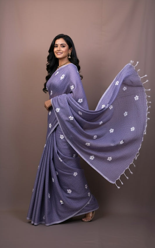 Sutrayan Lavender Bloom - Handwoven Cotton Saree with Daisy Embroidery
