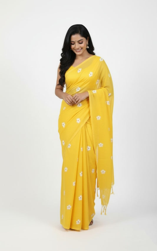 Gulbahar — Sunshine Yellow Cotton Saree with White Daisy Embroidery